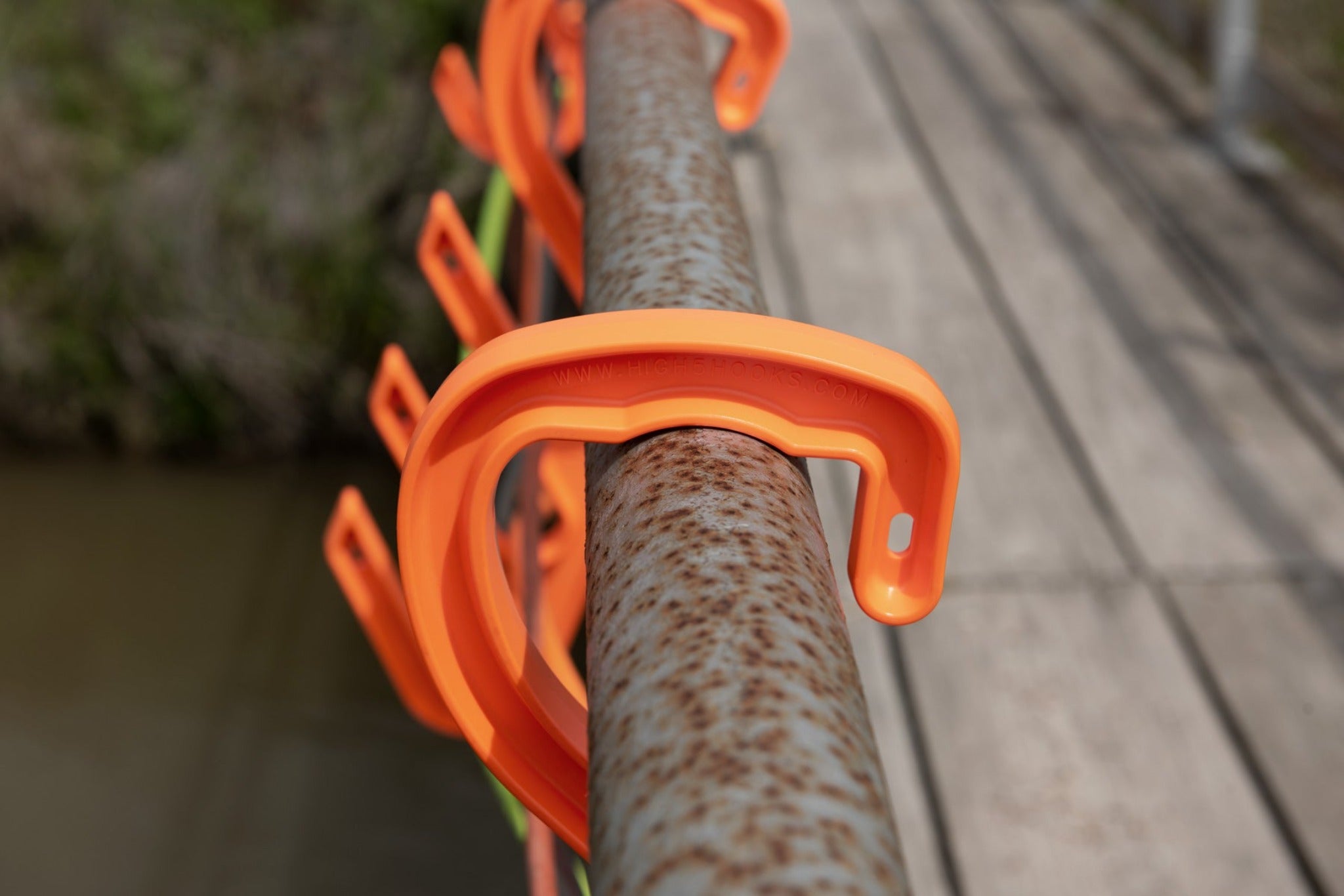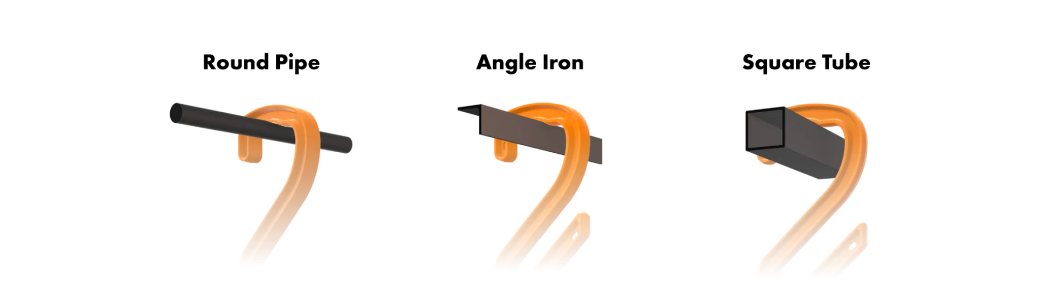 While standard S hooks are made to go on round pipe, High 5™ Hooks hang different. The H5H™ hooks will not only efficiently hook onto round pipe but also on angle iron and square tube guard rails. This new hook feature gives the H5H™ hooks increased usability and adaptability